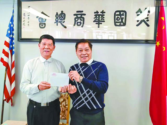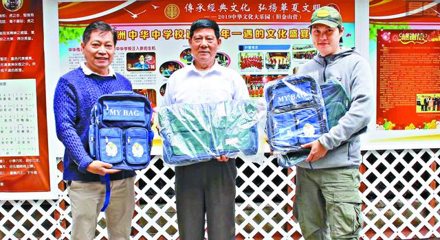 .c1 美國華商總會林志強副會長(左一)於6月25日攜公子林嘉信(右一),前往美洲中華中學校,向該校捐贈一百多個書包和一批圖書,目的是鼓勵後輩學好中文。林志強副會長發表感言,說其三個孩子都曾經在中華中學校學習中文,希望他們學有所成,日後在工作上及生活中更能發揮所長,為社會作出貢獻。他并言,中文是母語,在海外傳承中華文化應助力,添磚加瓦!林嘉信校友看到自己的母校近年在校園文化建設等方面,做得很好,中華中學校在社區的聲譽也不斷提升,感到十分高興。文:特約記者葉坤玲/圖:中華中學校提供