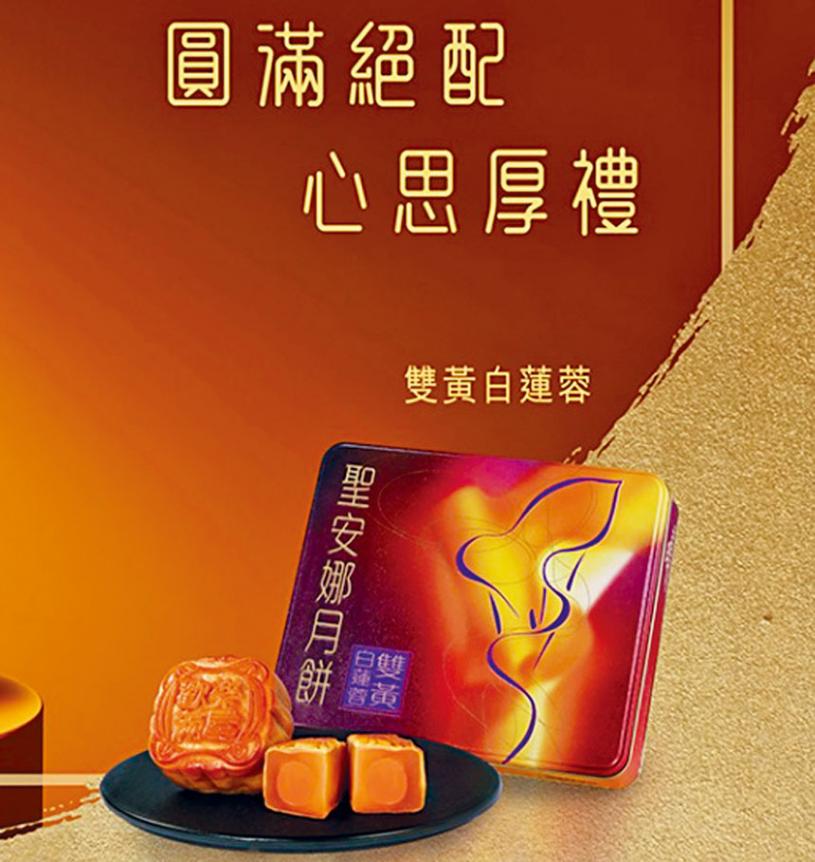 聖安娜經典雙黃白蓮蓉月餅,頂級鴨蛋黃與柔軟清香的蓮蓉搭配,實惠大方。