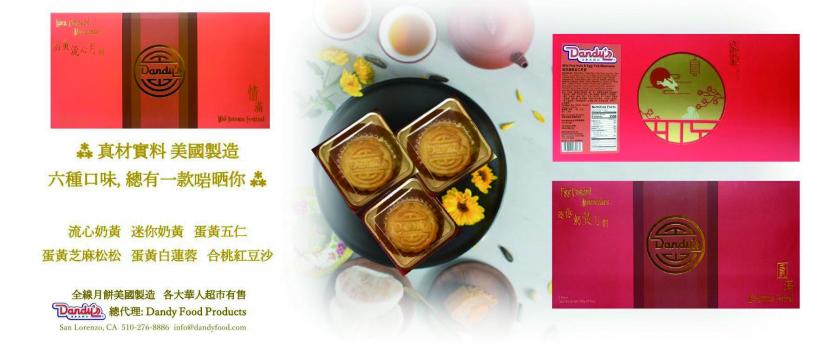 (工商新聞)San Lorenzo, CA – 要歡渡與別不同的中秋節, Dandy’s丹迪士食品為您呈獻一系列新款月餅, 嚴選上乘食材, 於美國工廠自家製造多款精品月餅. 一系列月餅全部真材實料, 新鮮烘焙, 追求健康輕怡的您可選擇特色迷你月餅, 丹迪士給消費者提供更多美味選擇. 丹迪士月餅共六種口味, 總有一款適合您. 丹迪士月餅, 令味蕾滿載驚喜.