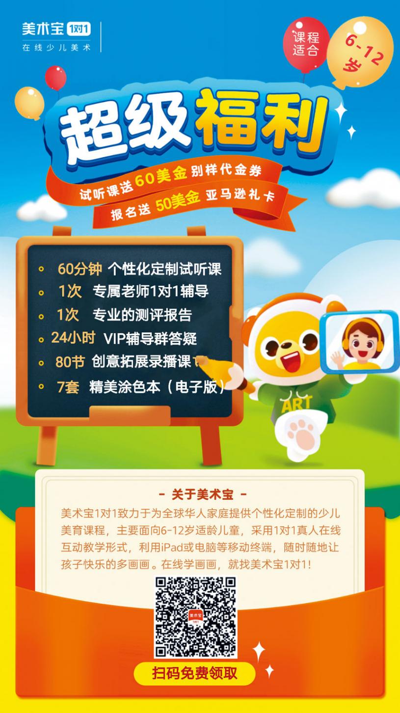 據介紹,美術寶是1V1授課的創新模式,家長及其孩子均可以掃碼或登錄鏈接進行免費體驗,登錄鏈接:.https://activity.meishubao.com/h5/1v1/overseas/B?contact=2&baimg=1&tencent=1&language=1&channel=8595262。
