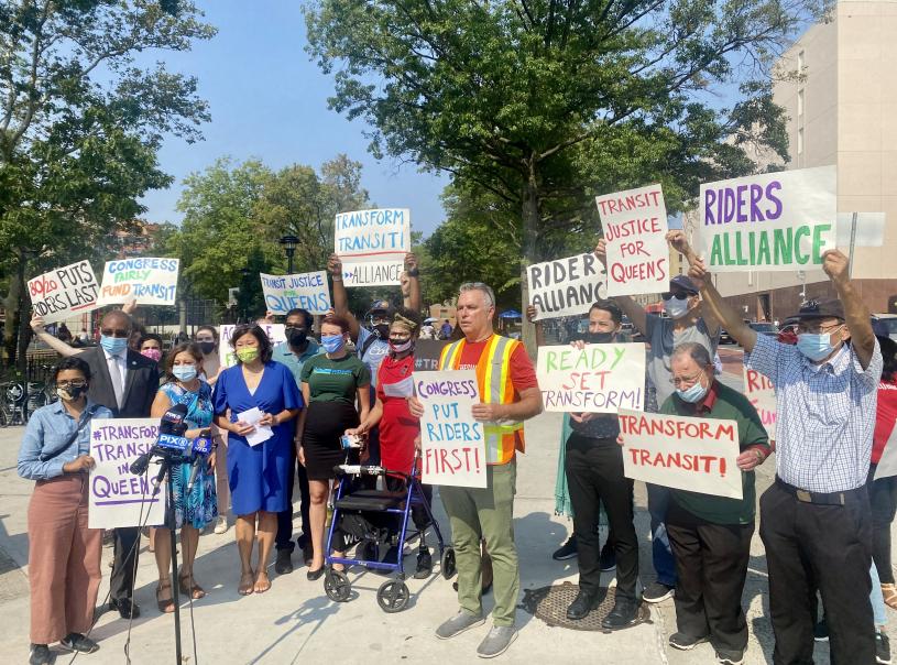 (Michael Gianaris)、州眾議員克魯茲(Catalina Cruz)等民意代表和公交維權組織「乘客聯盟」(Riders Alliance)於14日在皇后區艾姆赫斯特集會。他們敦促聯邦通過相關法案,以每年向大都會捷運局(MTA)提供30億元資金。