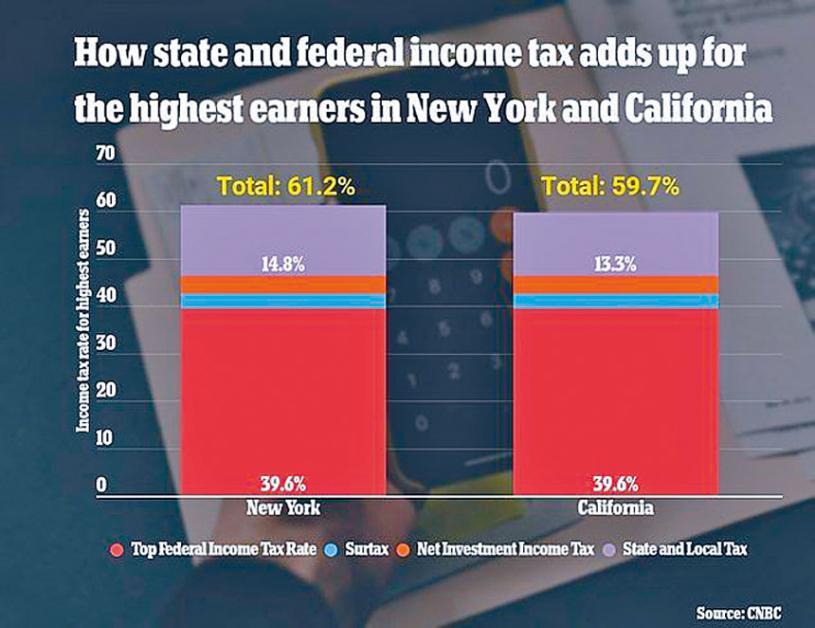 根據眾議院民主黨人提出的加稅方案,紐約市的最高收入人群,若將聯邦稅、州稅及市稅加起來,將可能面對要繳交高達61.2%的稅率。而在加州該稅率也將達59.7%(見圖)。