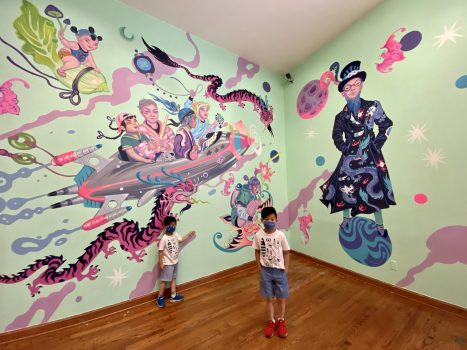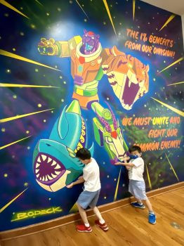 本次畫展的風格深受孩子們喜愛,圖為Lauren YS楊蜘蛛的壁畫作品。記者周信攝