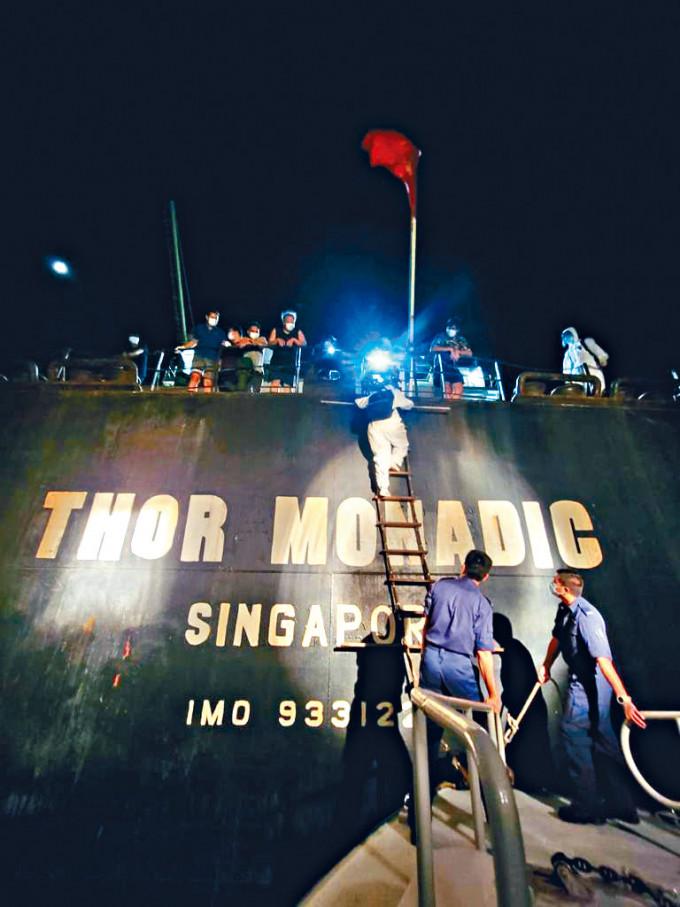 (星島日報報道)印尼來港貨船船長涉嫌虛報資料,上月向衞生署申請「自由無疫通行證」抵港,被揭發他自己和十四名船員集體染疫,須送院治療,警方徵詢法律意見後,昨採取行動登船拘捕泰籍船長帶署,落案控以詐騙罪名,今日押解上庭應訊,至於船長虛報資料目的,是否為博取治療機會,警方仍在追查中,今次是疫情爆發以來,首宗船長因瞞疫被拘控。