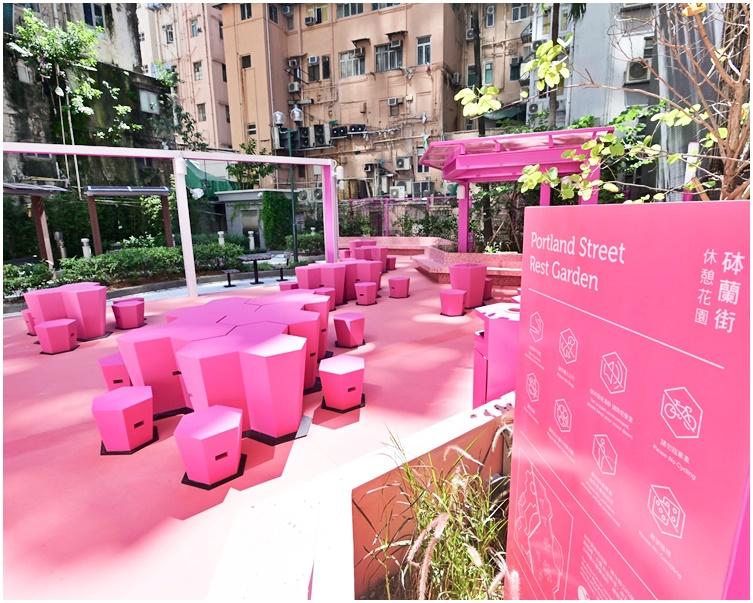 油尖旺區砵蘭街休憩花園完成翻新工程後變身為迷人Pink公園,明日中午12時起重新開放給公眾使用。翻新後的花園,一半地方全以粉紅色設計,從椅子、地面、指示牌、開花植物、柱、枱,甚至象棋棋盤,均換上耀目的粉紅色,設計新鮮又前衛,勢必城區內打卡熱點。