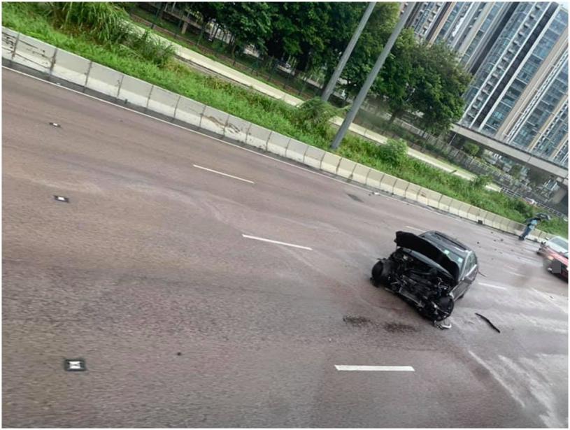 早上6時58分,往九龍方向的意外涉及5車連環相撞,其中1名司機受傷送院。現場為近天賦海灣,意外涉及3輛私家車、1輛的士及1輛客貨車,當中的黑色私家車車頭嚴重損毀,橫亘馬路中央,碎片散落一地。