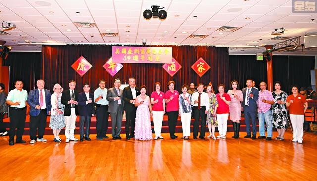 星島日報美西版社長梁建鋒致詞,他盛贊今天慶會上,長者們及嘉賓開心唱歌,快樂跳舞,呈現一派熱鬧歡樂的氣氛,為僑社活動樹立良好的榜樣。梁社長代表星島日報贈送999.9鍍金吉祥金牛作為幸運抽獎,並與獲獎者合影留念。