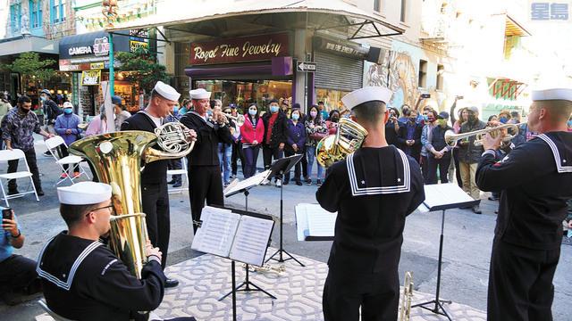 艦隊周「藍天使」特技飛行在華埠上空呼嘯而過,海軍管樂隊也帶來了響亮的軍樂以及充滿慵懶韻味的爵士樂;當然少不了柔功門的鑼鼓醒獅,在梅花樁上翻騰;更有英姿颯爽的少年,演繹拳腳刀槍功夫。中西文化薈萃,演繹疫情以來獨特的艦隊周活動。