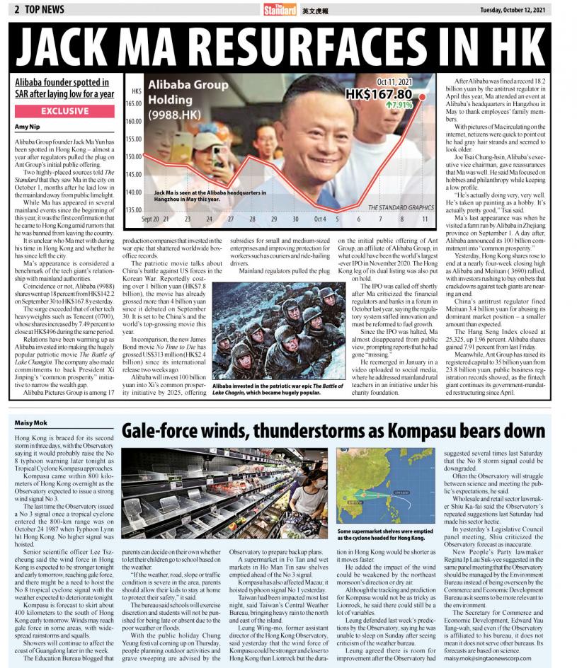 (星島日報報道)自阿里巴巴(9988)深陷監管風暴漩渦,阿里巴巴創辦人馬雲的行蹤便備受關注。《英文虎報》獨家報道,馬雲於十月一日曾在香港現身,是他自監管機構聯合約談,令螞蟻集團取消上市大計近一年後,首度在香港現身。有消息指,馬雲近日現身香港與商業夥伴會晤,並參加一些聚會。據傳,馬雲最快昨日已離港,但消息未獲證實。