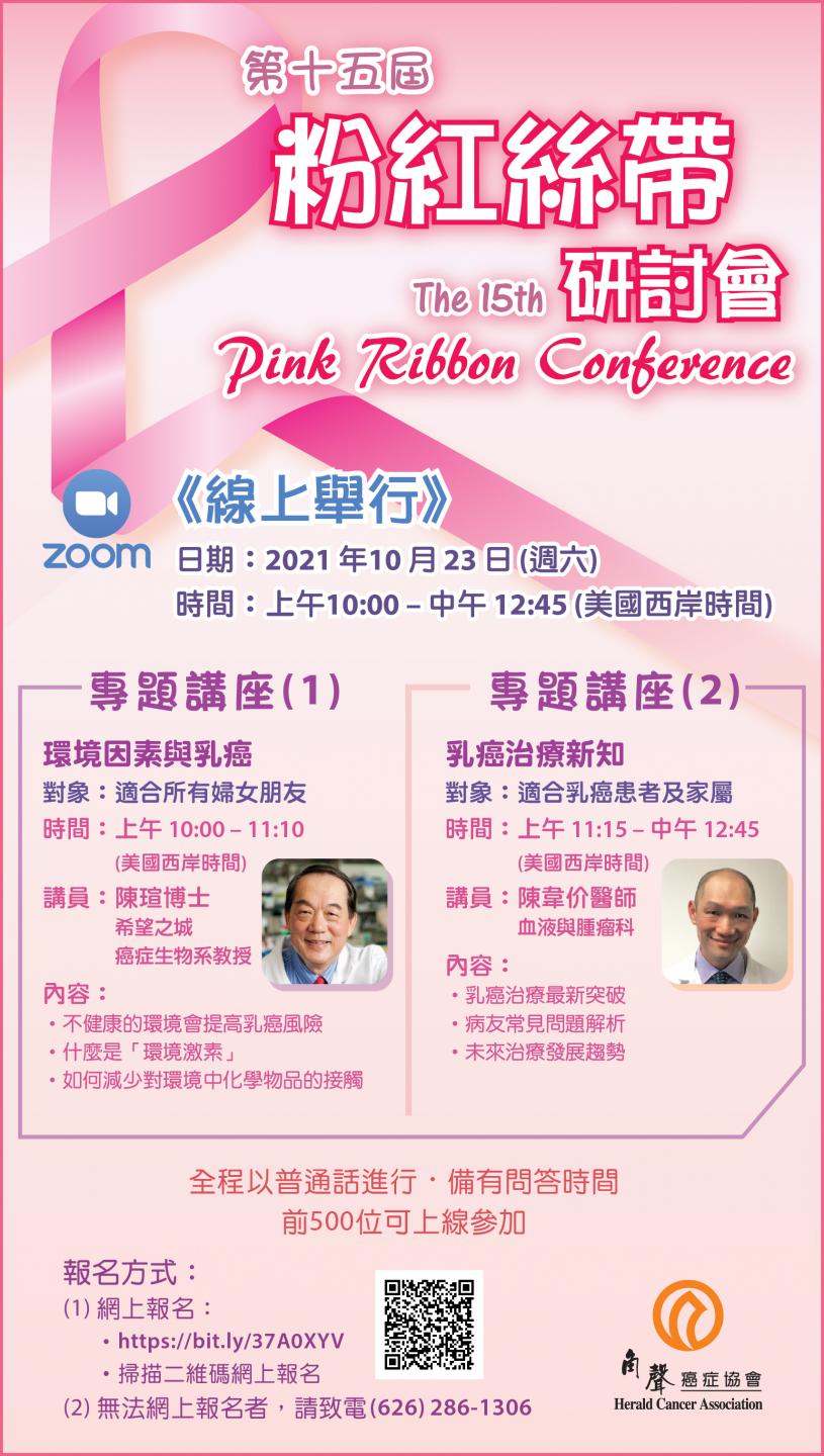角聲癌症協會主辦一年一度的《粉紅絲帶研討會》,今年因疫情仍在線上舉行,開放給社區朋友及乳癌患者與家屬參加。日期是 10 月 23 日 (週六) ,時間是上午10:00 至中午12:45 (美國西岸時間)。全程以普通話進行,前 500位可上線參加。