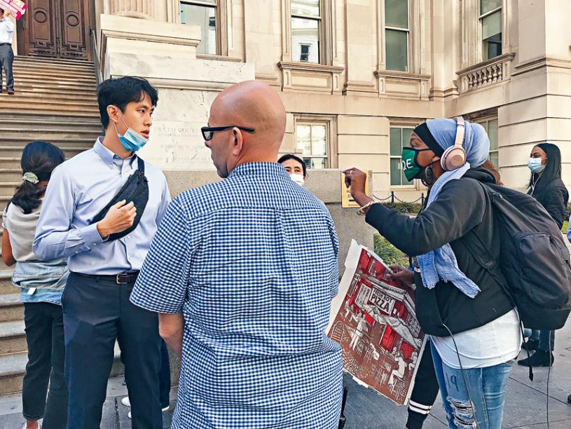 警員拉開Giaby按著她的激動,另一位華人則與唱對台非裔女子的不斷溝通,企圖進行遊說。示威者拿著五花八門的紙牌,把那唱對台的三人擋住,令她們無法進入中外媒體的視線範圍,事件才告一段落。