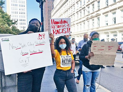 市長白思豪的教育政策不單惹來眾多人的炮轟,也間接製造了族裔的矛盾,昨日眾多家長在教育局前集會,當一位非裔家長反對取消天才班時,另一位唱倒台的非裔示威者高聲駡他「出賣黑人社區,令作作嘔」等字眼,場面一度出現對峙,由警員出面維持秩序。