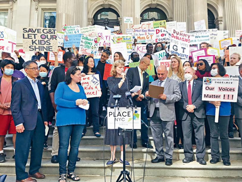 集會由PLACE NYC主辦,這是兩年前始於市長有意取消SHSAT後倡議教育政策的組織,昨有二百多家長來自這組織出來炮轟市長。