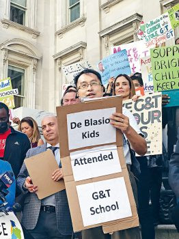 家長Reily說,白思豪的教育政策是倒退的,他以為打壓學童的天才班就可以減低族裔成績的差距,對於全面降低學童的水準的後果置之不理,紐約學生不單失法了國際競爭力,他把紐約優良學區弄成被詬病的底特律的壞學區。