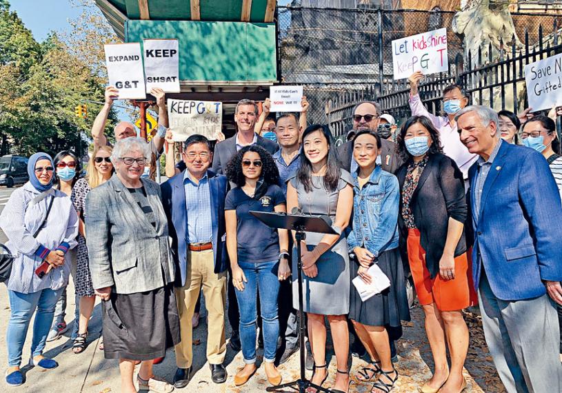 國會眾議員孟昭文、紐約州參議會紐約市教育委員會主席劉醇逸、紐約州參議員史塔文斯基(Toby Stavisky)、州眾議員布恩斯坦(Ed Braunstein)、大衛魏普林(David Weprin)、市議員顧雅明及郭登祺(Barry Grodenchik),26學區學區委員與家長會主席Cathy Grodzky等與擎著寫著保留天才班的不同族裔家長反出對白思豪市長沒有與學區家長溝通,反對聲音不絕的情況下,單方面宣佈廢除天才班,令人感到憤怒不己。