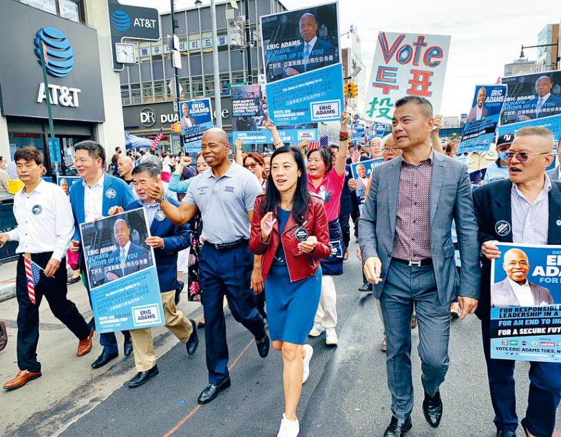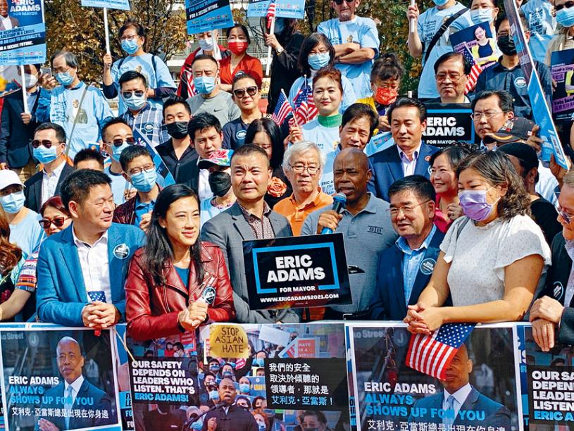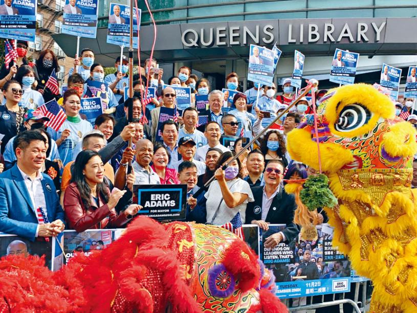 紐約市公職大選11月2日投票倒數兩星期,亞裔之友總聯盟等來自皇后區,布碌崙和曼哈頓的華人團體,韓裔社區領袖16日在法拉盛圖書前為競選紐約市長的亞當斯(Eric Adams)和民主黨20選區市議員提名人黃敏儀(Sandra Ung)舉辦濃厚中國傳統文化色彩的造勢大會,寓意吉祥,勝利的彩獅起舞採青,鑼鼓喧天熱鬧,亞當斯向現場的數百支持者承諾,若當選下任紐約市長,將不遺餘力打擊破壞社會安寧的反亞裔仇恨犯罪和任何歧視事件,讓不同族裔市民安居樂業實現「美國夢」。