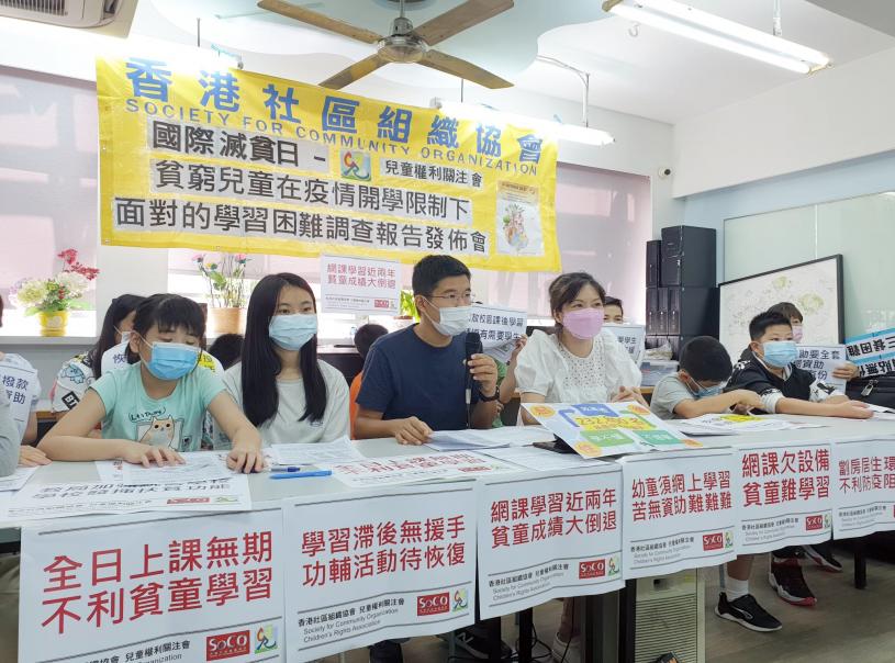 基層兒童在疫情下的學習進度大受影響。社區組織協會與兒童權利關注會訪問近400名基層兒童,發現兩成半人家中無電腦上網,三成三家中無安裝固網。在網課下,近七成人坦言跟不上進度,56%人學習成績退步;82%學童難以長時期專注上課。