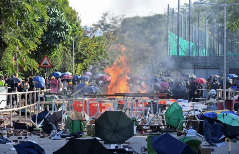 前年11月11日「黎明行動」,有示威者於中大二號橋向吐露港公路投擲雜物及向警方投擲汽油彈,警方向校園投射催淚彈後入內當場拘捕5名中大生,控以暴動、違《禁蒙面法》等罪。5人早前否認控罪,經審訊後被裁定所有罪名成立。區域法院暫委法官張潔宜今於西九龍法院判5人監禁4年9個月至4年11個月。