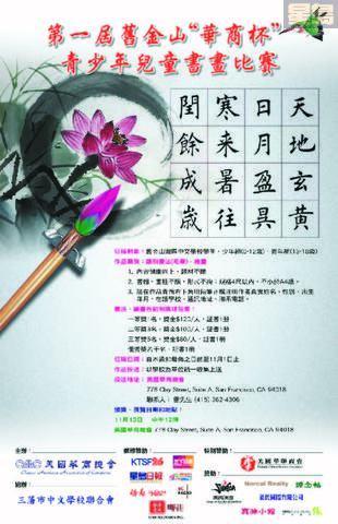徵稿對象:舊金山灣區中文學校學生,分6至12歲的少年組、13至18歲的青年組;作品類別:書法(毛筆)或繪畫;作品要求:1·內容健康,題材不限;2·書體畫種不限,形式不拘,規劃4尺以內,不小于A4紙;3·請在作品背面右下角用鉛筆正楷寫上作者真實姓名·性別·出生年月·在讀學校·通訊地址及聯絡電話;徵稿日期:自見報後之日起至11月1日止,以學校為單位統一收集後,投送到主辦單位美國華商總會。地址:778 Clay St,#A,S·F·,CA 94108,聯系人,廖小姐(415)362-4306。書法、繪畫領獎項分為:A·一等獎1名,獎金120∕人,證書1冊;B·二等獎3名,獎金100元∕人,證書1冊;C·三等獎5名,獎金80元∕人,證書1冊;D·優秀獎若干名,證書1冊。頒獎及展覽日期和地點點如下,11月13日中午12時,假座三藩市美國華商總會禮堂(788 Clay St, #A,SF. CA 94108)舉行。