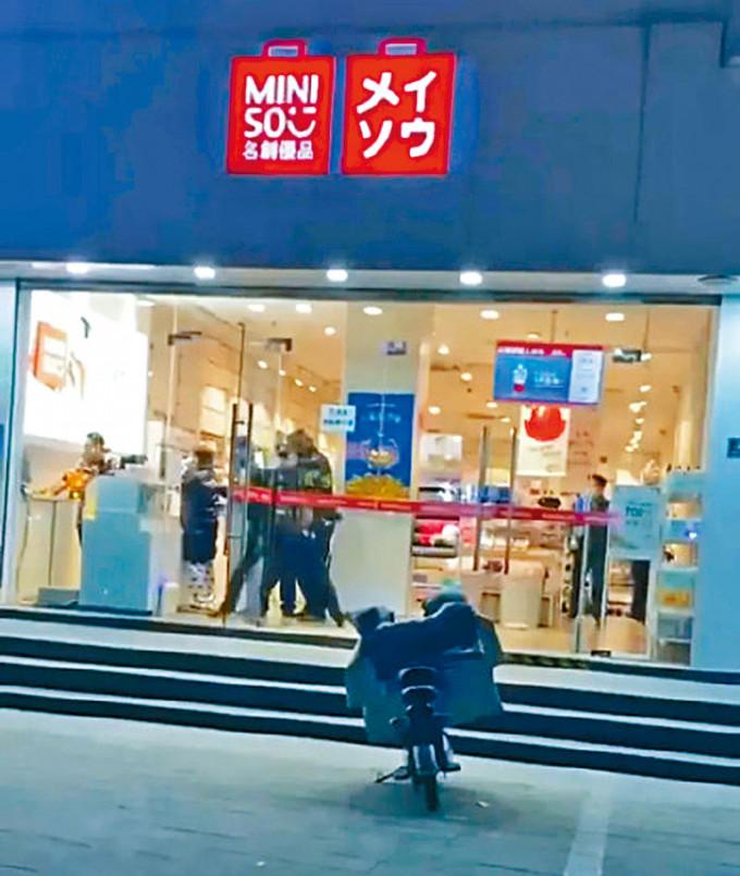 互聯網上的視頻顯示,現場是一家「名創優品」雜貨店,警方在商鋪門口拉起警戒線,不斷有民警進出店鋪,店外有手持盾牌的民警嚴陣以待,店鋪內有數名醫生。而在警戒線外則有大批群眾圍觀。