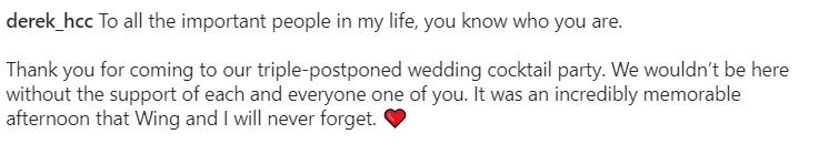 Derek的婚宴以簡約為主,會場佈置以紅白玫瑰為主,Derek亦有在IG貼上婚宴的相片並說:「感謝您參加我們延期了三次的婚宴,假如沒有你們每一個人的支持,我們就不會在這裡, 這是一個令人難忘的下午,Wing 和我永遠不會忘記。」