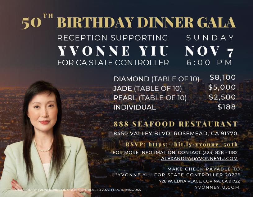 【洛杉磯訊】將於明年競選加州審計長 (State Controller) 一職之饒影凡 (Yvonne Yiu),將於11月7日舉行慶生暨競選籌款晚宴,歡迎社區各界鼎力參與支持。