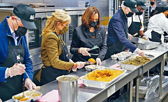 美聯社報道,拜登與第一夫人吉爾、賀錦麗與丈夫任德龍(Doug Emhoff),23日前往華盛頓市內的社企DC Central Kitchen,4人與機構員工交流後,便穿上圍裙加入工作行列,將煮好的火雞肉、醬汁、甜薯、青豆等放入食盒,方便送往基層民眾家中。據悉大餐的食材全部來自華府周邊的本地農場,經中央廚房統一烹調後,再以低廉價格售予有需要的人士。