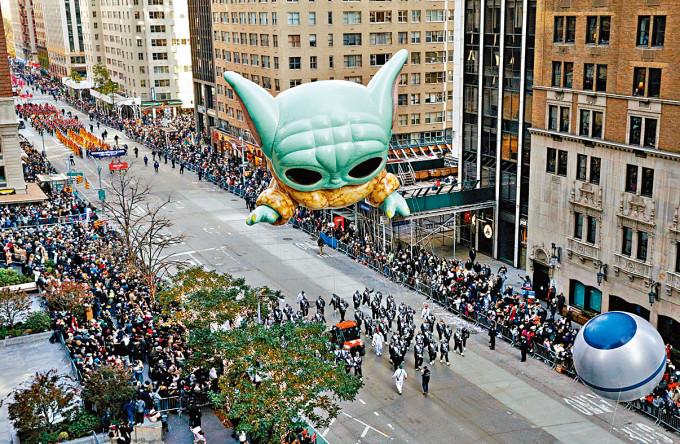 (星島日報報道)周四,第九十五屆梅西百貨感恩節大巡遊在美國紐約曼克頓舉行。主辦方稱,到現場觀看的民眾約達二百五十萬人。參與巡遊的行進隊伍和相關工作人員都接種了新冠疫苗,活動方強調暫不允許十二歲以下的兒童登上花車。主辦方也要求十二歲以上的公眾若想現場觀看,也應接種疫苗,並鼓勵所有人佩戴口罩。去年,受新冠疫情影響,梅西百貨感恩節巡遊縮短了遊行路線,將遊行參與人員數量減少約八成八,不設現場觀眾區,僅以電視和網絡直播的方式進行。今年,這項活動全面回歸,觀眾在傳統約四公里長的遊行路線附近,欣賞由十五個巨型氣球、二十八輛花車以及行進表演組成的節目。新款造型的巨型氣球包括尤達寶寶、小科學家阿達、新版的比卡超等。