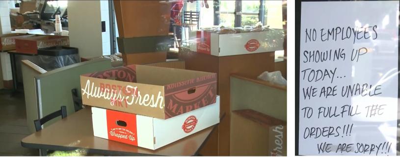 據《KTLA 5》報道,許多手持訂單的顧客在感恩節當天早上前往位於FootHill Boulevard的連鎖餐飲集團「波士頓市場(Boston Market)」店面時,赫然發現餐廳門上張貼標語: 「今天員工都未出現,抱歉我們沒辦法完成訂單!」