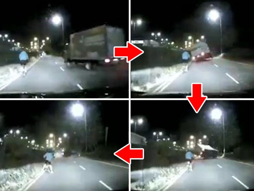 肇事貨車前面一輛私家車的前後車Cam拍下意外經過,事後將有關片段被放到社交平台。從片中見到,當時私家車沿翔東路行駛,惟前方左邊路旁有人踩單車,於是收慢車速,但後方駛至的貨車疑收掣不及,扭軚閃避時失控,輕微刷過右邊草叢後,再反彈出路面,並向左翻側,而單車漢亦嚇得立即停下來。