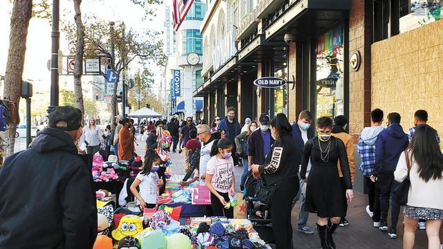 年末臨近,三藩市市區中心近日雖飽受一連串商鋪搶劫案影響,但人流依舊熱鬧。眾多名商店窗門外牆貼著木板,但絲毫不影響市民逛街購物的心情。