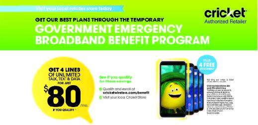 A:今天要和大家分享的重點就是近段時間風頭火勢的EBB(緊急寬帶福利)!聯邦政府在今年5月撥了2億美元給通訊公司,目的是在新冠疫情期間幫助符合資格的低收入家庭減免電話寬帶費用。而Cricket捷風傳訊積極響應聯邦政府的號召,從現在開始,無論你從哪家公司帶號轉台到捷風傳訊,抑或直接在捷風傳訊開新號碼,只要你符合資格,四條線只需要$80一個月,就可以享受到Cricket最新最高速的無限流量5G套餐,絕對是同行之中最低價,快點致電833-789-5678來咨詢吧!