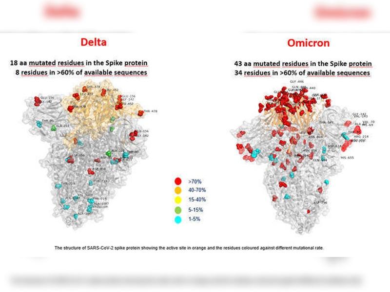與先前出現、突刺蛋白突變相當多的Delta病毒相比,Omicron病毒擁有更多的蛋白突變,且相當多樣化,並且大部分位於與人體細胞相互作用的區域。
