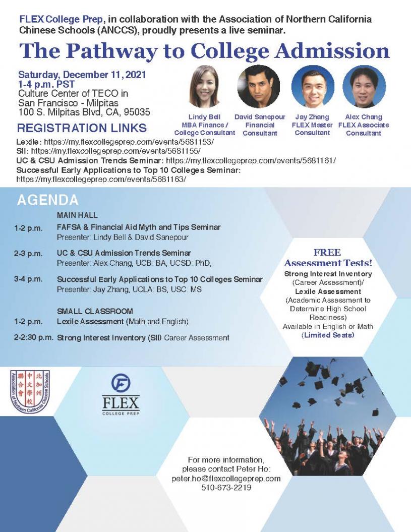 通往大學之路的教育講座及學生評鑑測試活動將於12月11日周六下午1時至5時在北加州Milpitas華僑文教中心 Culture Center of TECO in San Francisco – Milpitas, 100 S. Milpitas Blvd, Milpitas, CA, 95035盛大舉行 。 相信身為家長的您一定會關注這個教育盛事的。講座中會替高中學生提供最新大學入學申請過程中的內幕及鮮為人知的祕辛。講座的目的是替家長釐清整個申請大學的過程並且提供可靠及信賴的資訊;進一步幫助學生及家長事先製定成功的大學入學申請或申請表格的策略 。活動內容包括有升學講座,主題含概為什麼加州大學入學越來越困難?私人立大學的入學指標為何?標準化考試仍然有必要去考嗎?AP考試及課程要多少門才足夠?課外活動的重要性等。除上述主講廳的講座外,Flex College Prep新法教育學院還規劃英文、數學評鑑考試Lexile、大學主修及SII生涯評估,以上2項活動適合6至10年級的學生參加。