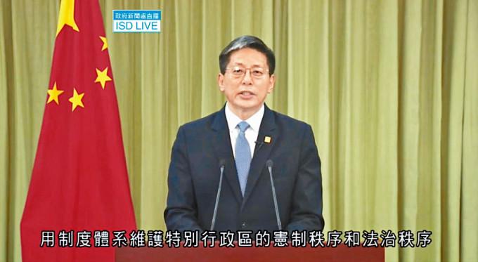 第四是堅持依憲治國、依法治港。他說中央始終把特區放在依憲治國的總體格局中審視和把握,例如通過人大常委會多次立法解釋,闡明《基本法》條款含義,解決特區政制發展、居留權、特首任期等重大問題。特別近兩年面對「修例風波」帶來的複雜局勢,中央始終堅持法治原則運用「決定加立法」、「決定加修法」等法治方式妥善應對。