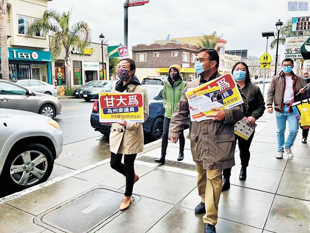 加州眾議院第17區席位因邱信福轉任三藩市市府律師後暫缺,明年2月舉行特別選舉。候選人之一的前市參事、現地檢署幕僚長甘大為(David Campos),周日與現任第一區市參事陳詩敏 (Connie Chan)一起赴華人聚集的寶多拉區(Portola District)走訪當地商戶積極拉票。