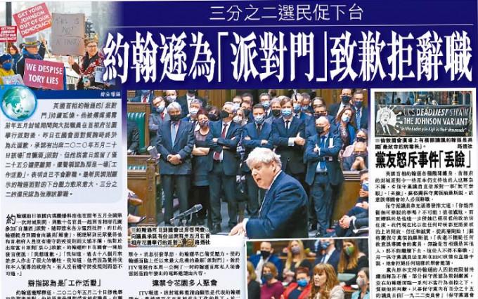 (星島日報報道)英國首相約翰遜的「派對門」持續延燒。他被傳媒揭露前年五月封城期間與大批職員在首相府花園舉行派對後,昨日在國會面對質詢時終於為此道歉,承認有出席二○二○年五月二十日該場「自攜酒」派對,但他說當日逗留了僅二十五分鐘便離開,還聲稱認為那是一場「工作活動」,表明自己不會辭職。最新民調則顯示約翰遜面對的下台壓力愈來愈大,三分之二的選民認為他應該辭職。