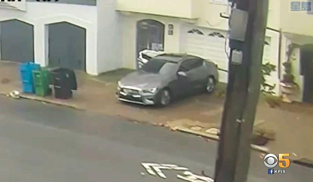 差不多在童先生發現賊人企圖闖入的同時,隔了幾棟房子的鄰居家安裝的監控錄像拍到一輛灰色Infiniti停在門前,並見到有一個人從車內鉆出來,走到民宅前敲門。