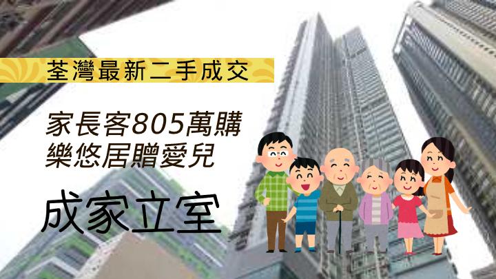 中原高級分行經理余仲平表示,荃灣樂悠居極高層02室,面積435方呎,兩房間隔,景致開揚,可享海景,叫價830萬,減價25萬,至805萬獲承接,呎價18506元。買家為區內業主,年前遷入荃灣居住,有感區內環境及配套十分理想,遂多購一個單位予兒子將來成家立室之用。原業主則於2000年斥資291萬購入單位,持貨22年轉售,帳面獲利514萬,單位期內升值1.8倍。