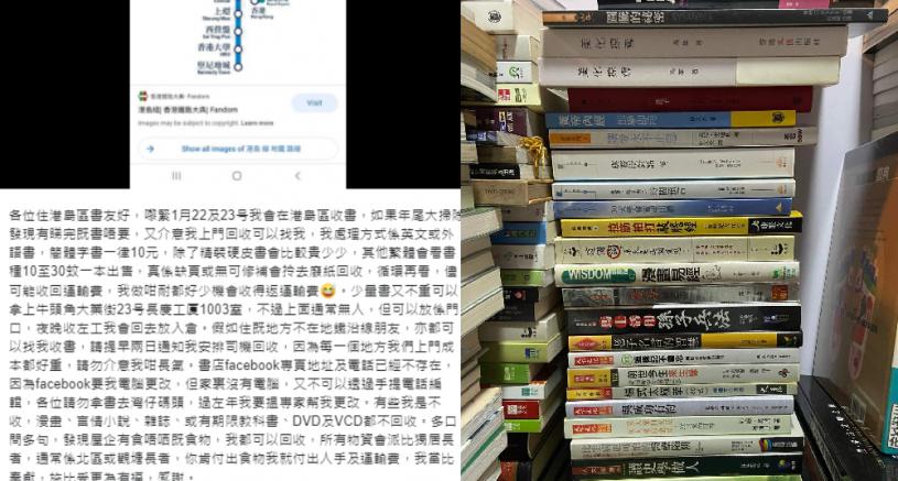「書式生活」昨日(16日)在facebook專頁發文,指將於本月22至23日在港島區收書,店主聲稱指回收得來的書籍會分類處理,英文或外語書、簡體字書一律以10元出售,精裝硬皮書以及其餘繁體書籍則會因應種類,以10至30元出售,如因缺頁或無法修補,則會以廢紙回收方式處理。