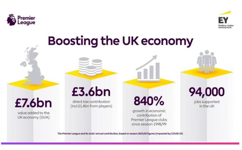 英超聯賽對英國經濟、社會的貢獻,超乎一般球迷想像。據安永會計師事務所一項研究顯示,儘管受疫情影響,導致球季停擺三個月,英超一九至二○球季依舊為英國經濟貢獻了七十六億鎊(約八百零八億六千萬港元)。
