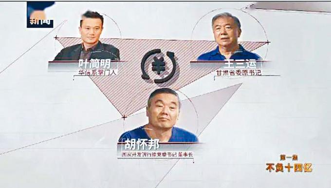 (星島日報報道)由中紀委攝製的電視專題片《零容忍》第一集《不負十四億》前天播出,披露華信能源有限公司在二○一五年向國家開發銀行申請四十八億美元的巨額貸款授信,甘肅省委書記王三運充當掮客,請託國開行董事長胡懷邦推動批准這筆貸款授信,王三運、胡懷邦各自從「華信系」掌門人葉簡明方面收受了數千萬元人民幣巨額賄賂。中紀委官員暗示,胡懷邦通過向葉簡明這種「神通廣大」的老闆進行利益輸送,妄圖給自己的個人仕途升遷鋪路。