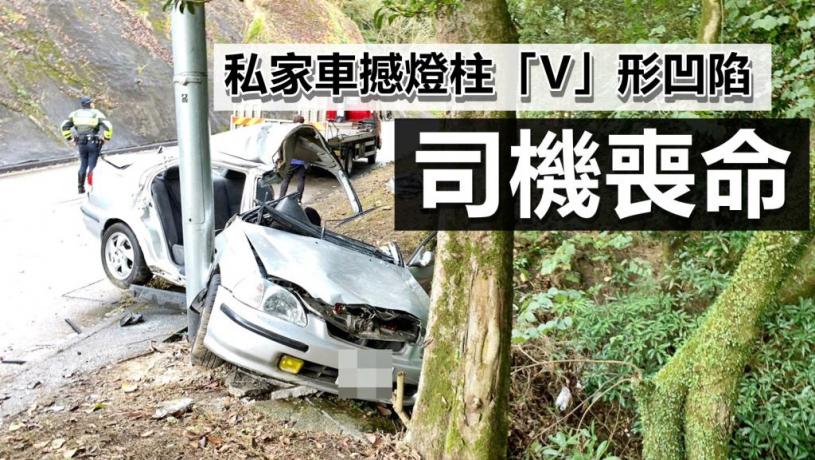 事發於今早7時12分,私家車沿荃錦公路往八鄉方向行駛,駛至近雷公田一時,懷疑因天雨路滑跣胎,攔腰撞向路旁電燈柱,司機位車門位置撞至「V」字形凹陷,車頂摺起。
