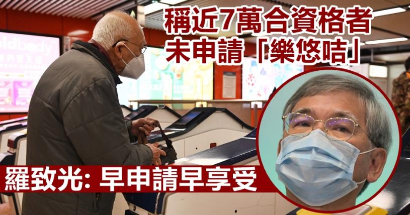勞工及福利局局長羅致光表示,至今仍有近7萬名相信屬合資格人士,尚未申請「樂悠咭」。他指難以掌握他們是否少留意新聞、毋須乘搭公共交通工具,或現時身處內地或外地生活,因此未有申請,呼籲市民協助「尋人」,提醒身邊合資格親友盡快申請,以便於下月底享用2元乘車優惠。