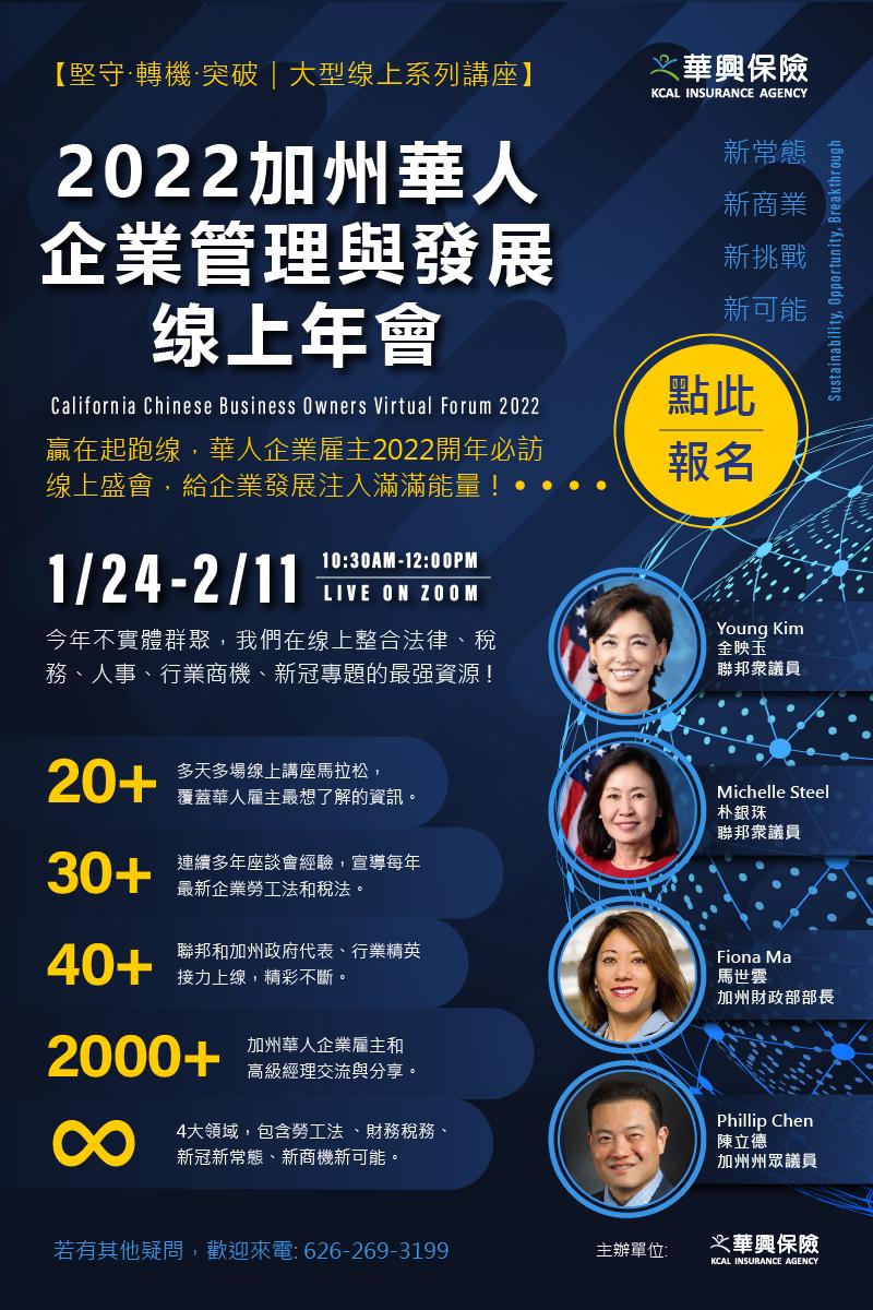 新年伊始,疫情捲土重來,諸多法規更新,雇主更是舉步維艱,充滿挑戰。多年來致力於服務社區的華興保險,本月底舉辦「2022加州華人企業管理與發展線上年會」,從勞工法、稅法、新冠新常態、新商機四個領域,整合最强講師資源,為企業雇主、人事、財務等高級經理,帶來最新資訊。同時也為各公司行號免費提供最新2022勞工法海報,現在登記還可附贈免費法律諮詢服務及全年人事管理電子報免費訂閲。