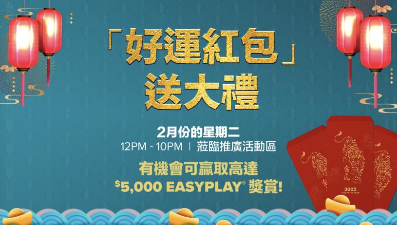 二月份更有「好運紅包」送大禮,將會在二月份逢星期二舉行,會員只需在活動期內的下午12時至晚上10時蒞臨推廣活動區刷刷會員卡就有機會獲取高達$5,000 EasyPlay獎賞。