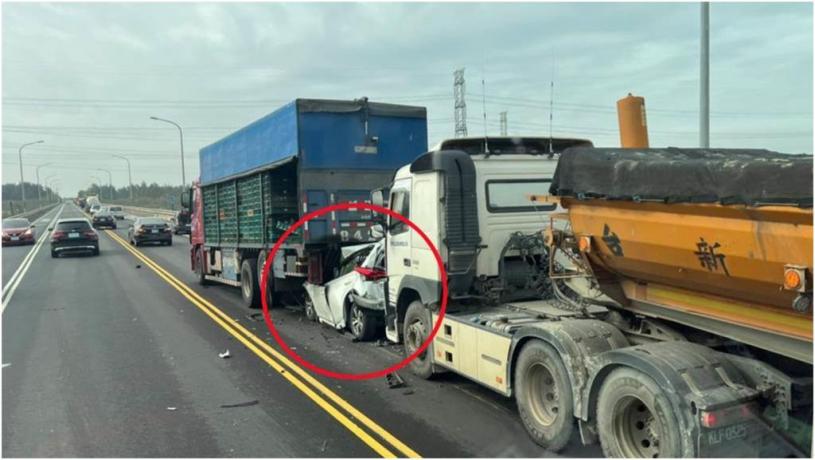 台灣彰化縣伸港鄉、中彰大橋南下路段,今日早上發生5車連環相撞車禍,其中一輛私家車慘遭貨車與砂石車夾在中間,壓成鐵餅,事件中6人受傷,2人傷勢嚴重。