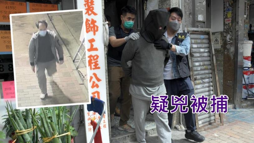 今早約9時許,有重案組探員到現場一帶調查。直到早上10時許,一批警員身穿避彈衣及手持盾牌,進入大南街一幢大廈,成功拘捕疑兇。在中午12時許,警方將疑兇押走,並將其帶上私家車後離開,又檢走疑涉案的鎅刀及衣物等。