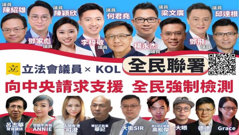 疫情嚴峻,一眾建制派立法會議員和KOL發起聯署,促請特首向中央求援,進行全民檢測及預留特效藥供港使用。聯署名單可謂陣容鼎盛,除了由KOL界進軍議會的李梓敬和陳穎欣,亦有由議員變身KOL的何君堯。其他藍營支持者耳熟能詳的人物,就有大衛Sir,華記正能量主持楊官華及空姐牛肉飯店主Annie郭德英等。議員方面,選委會代表陳紹雄、工聯會鄧家彪、西九新動力梁文廣及教聯會鄧飛也見於聯署名單。