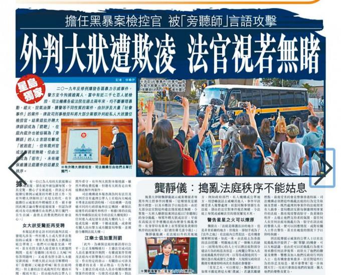 (星島日報報道)本報於上月中獨家揭露,擔任黑暴案的外聘檢控大律師,遭「旁聽師」言語攻擊及起底,導致有外聘大狀為了家人安全,不敢再接辦同類檢控工作後,引起各方關注。消息稱,律政司刑事檢控專員楊美琪昨透過下屬向專責示威案件的外聘大狀發出電郵,表示律政司認真關注外聘大狀的人身安全,為加強保安措施,乃要求他們若遇上受「欺凌」事件,立即知會刑事檢控專員辦公室,以讓刑事檢控科採取適當的行動。終審法院首席法官張舉能昨在法律年度典禮後,回應記者提問時重申「阻礙法官聽取證據、控辯雙方論據或作出判決,均屬有礙法庭工作……法官有權停止一些滋擾性行為,甚至要求該等人士離開法庭,更嚴重可能構成藐視法庭」。